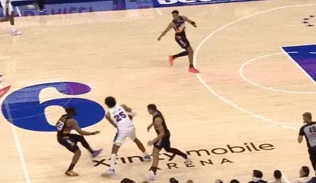 持球推进至弧顶,见自己无人看管、面前一面开阔地,赶在身侧追防的杰特霍华德到位之前,立即使用炸球一二步急停,追身三分拔起就射手起刀落打成3+1,帮球队完成完美的由守转攻。