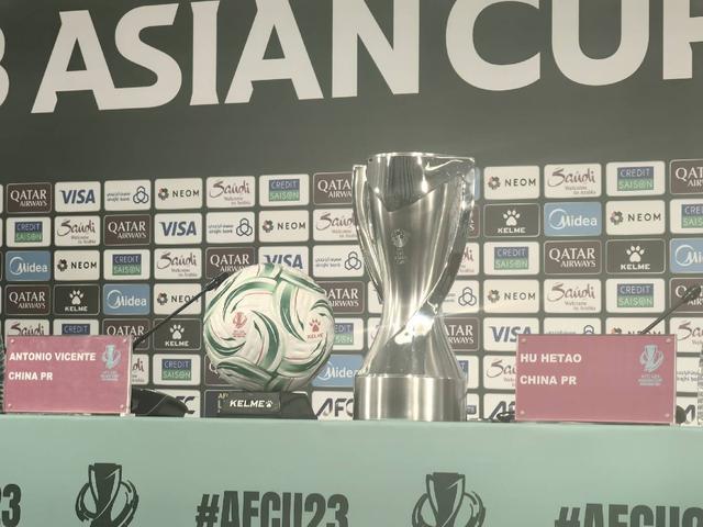 懂球帝记者 现场报道,北京时间1月23日,U23亚洲杯决赛中国vs日本的赛前新闻发布会在吉达阿卜杜拉-费萨尔王子体育场进行。中国队主教练安东尼奥携球员胡荷韬出席。