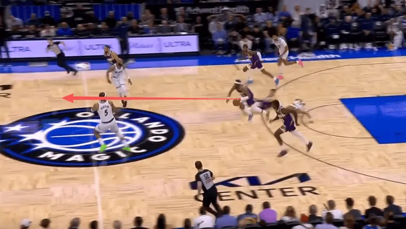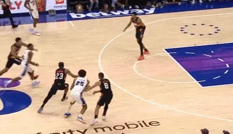 持球推进至弧顶,见自己无人看管、面前一面开阔地,赶在身侧追防的杰特霍华德到位之前,立即使用炸球一二步急停,追身三分拔起就射手起刀落打成3+1,帮球队完成完美的由守转攻。