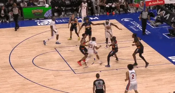 见艾维接球突破,古德温立即站住协防位置封堵突破路线,