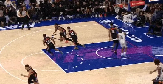古德温先是协防骚扰持球突破杜伦,在杜伦出球后再迅速转身兼顾奥萨尔汤普森。见奥萨尔接球启动突破,立即转髋使用交叉步紧跟,
